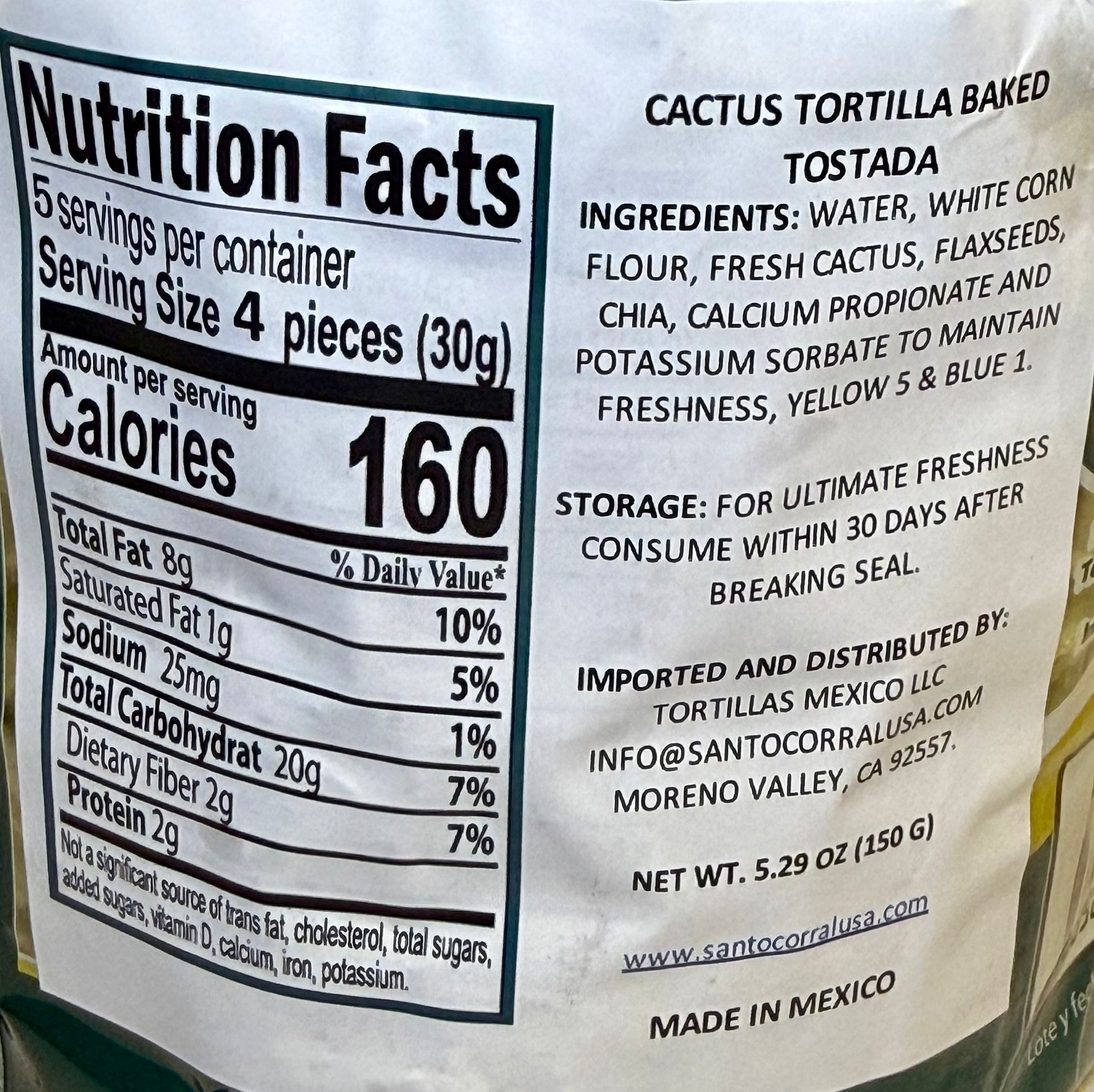 Nopal (Prickly Pear) and Sinaloa Corn Tortilla, made in Mexico, enhanced with healthy seeds such as Chia & Flaxseed. Great source of fiber!